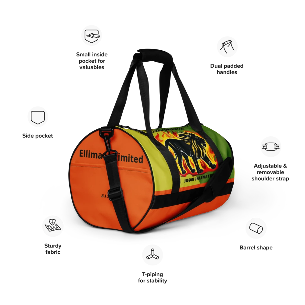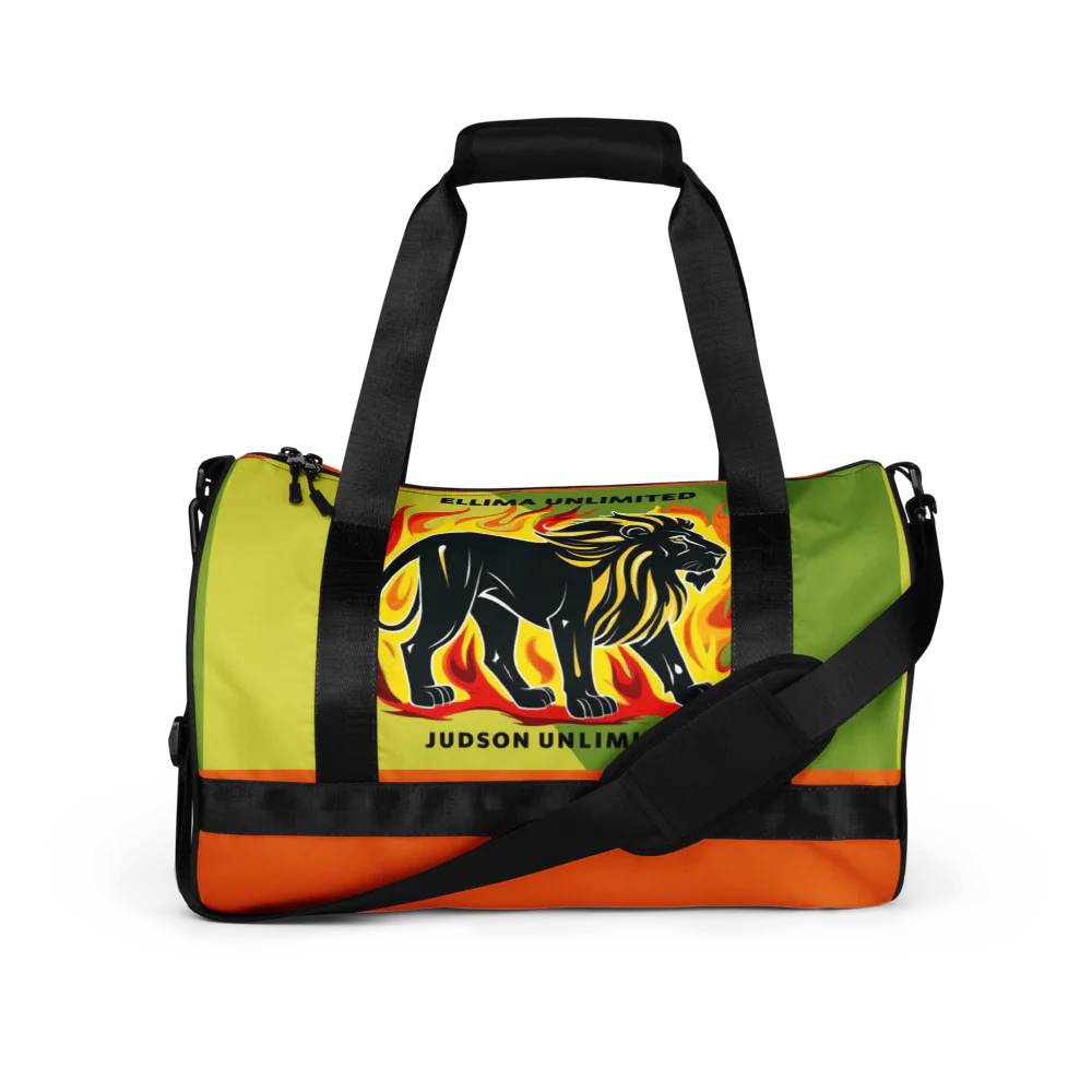 Ready to get your fitness on? Add some punch to pumping iron with this all-over print gym bag. Made from 100% polyester and sturdy, water-resistant fabric, this bag is fun meets function. And it’s got pockets! • 100% polyester • Fabric weight: 9 oz./yd.² (305 g/m²) • Capacity: 7.93 gallons (30 l) • Water-resistant and durable • Sturdy fabric with fusible backing to add firmness • T-piping for stability • Dual padded handles • Inside pocket for valuables