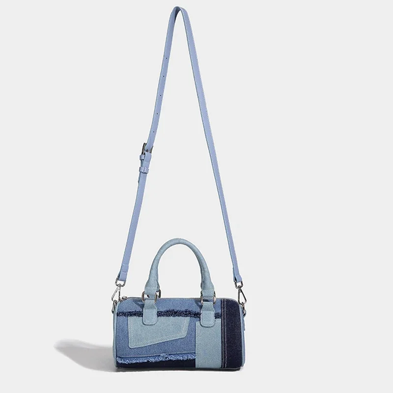 Cylindrical Boston Messenger Bags for Women Luxury Designer Handbag Purses 2024 New in Fashion Denim Splicing Shoulder Crossbody