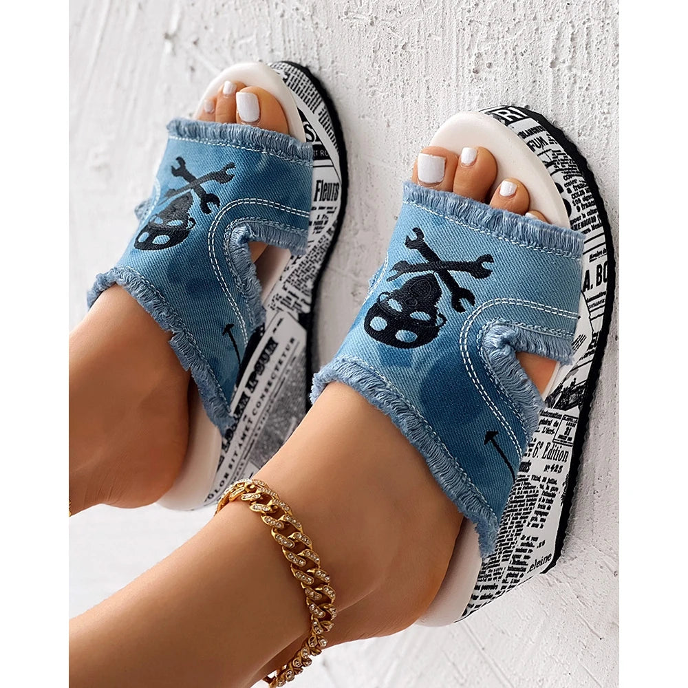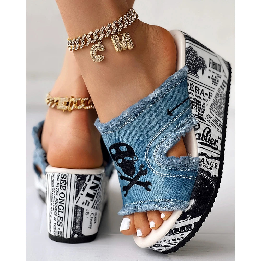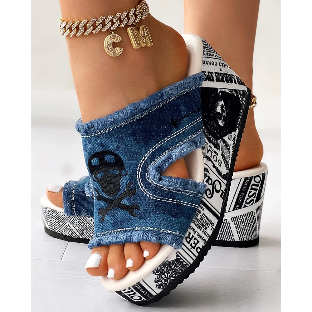 Women Newspaper Skull Raw Hem Platform Wedge Slippers